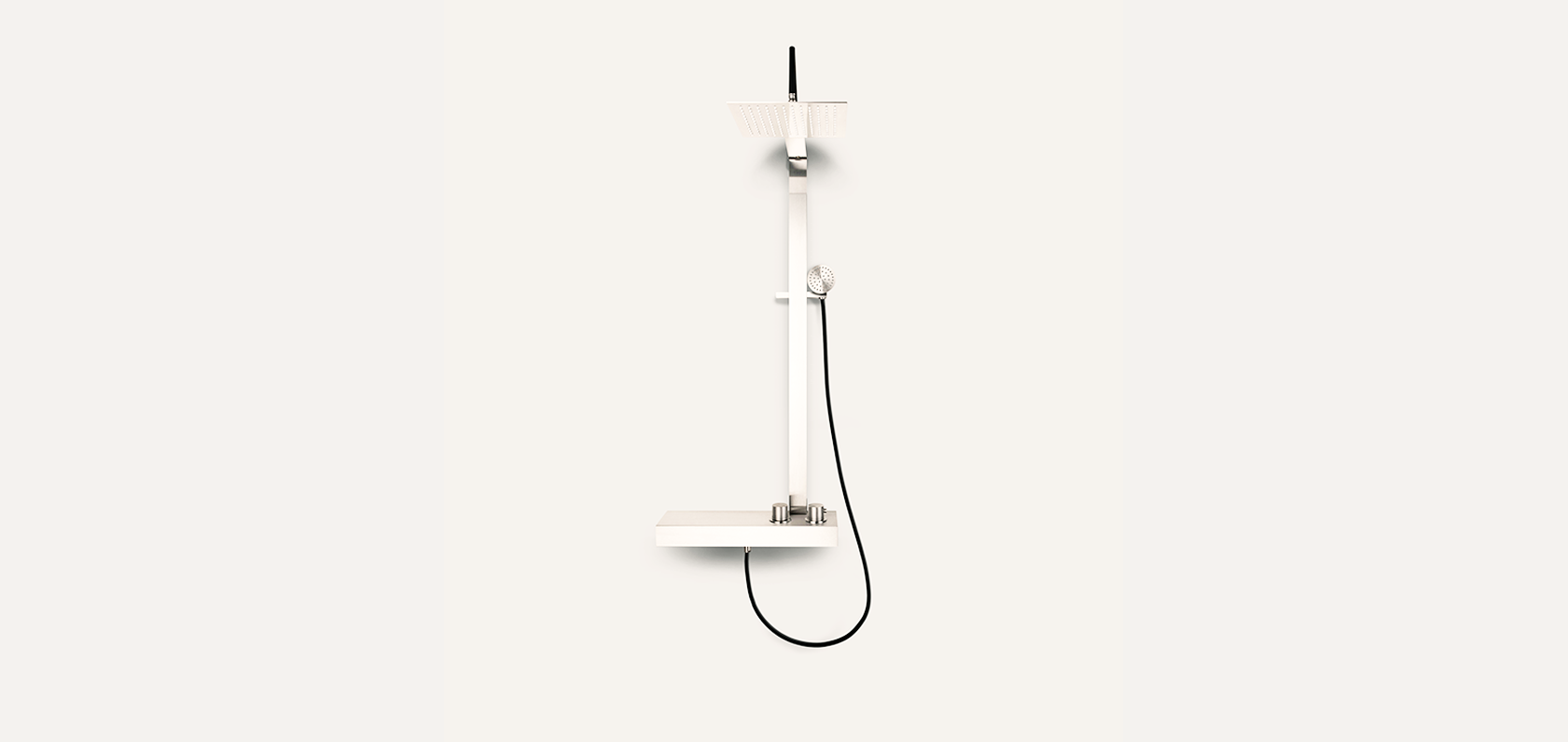 Colonna doccia in acciaio inox spazzolato composta da una asta verticale nella quale è presente uno scorrevole porta doccetta e una parte superiore con braccio spessore 3mm in acciaio inox spazzolato con possibilità di regolare la distanza del soffione dalla parete (da 35cm a 45cm) con flessibile PVC soft touch nero opaco.